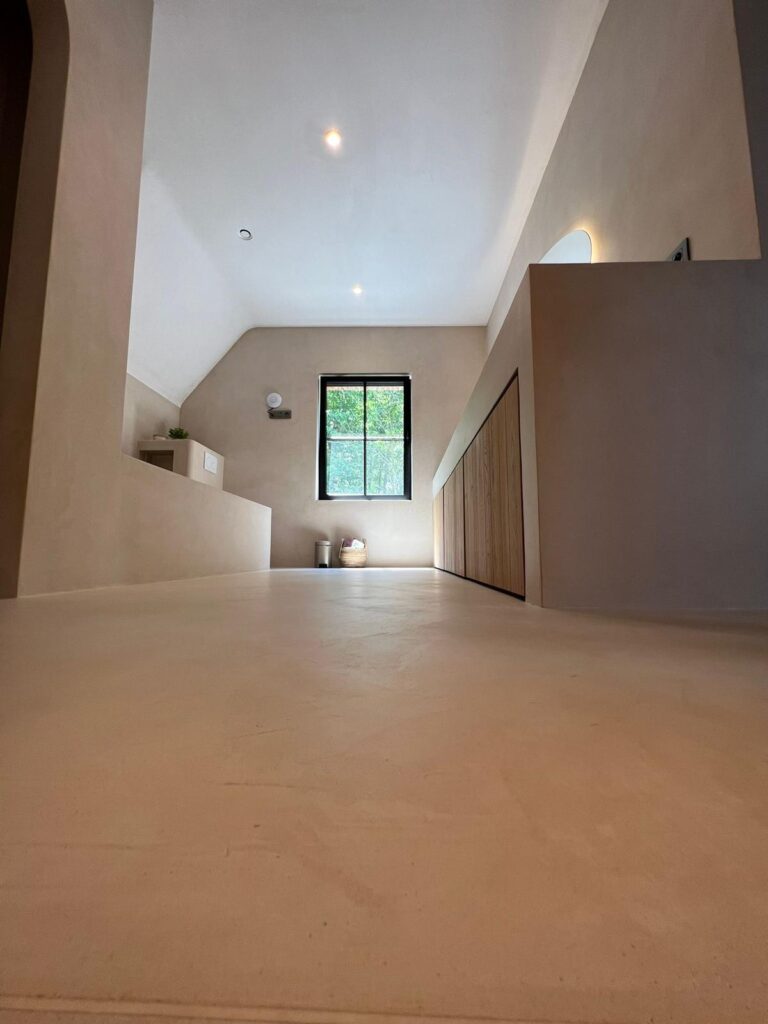 De binnenbezetters van In't Wit toverden deze badkamer in Ruiselede (West-Vlaanderen) om tot een hedendaagse, esthetische parel door Mortex aan te brengen op de vloer en wanden. Ook de muren kregen een naadloze afwerking in deze waterdichte sierpleister, en de badkamer kreeg karakter door de mortex badomranding en mortex douche We creëerden tot slot nog een bijhorende mortex tafel op maat; een echte eyecatcher.